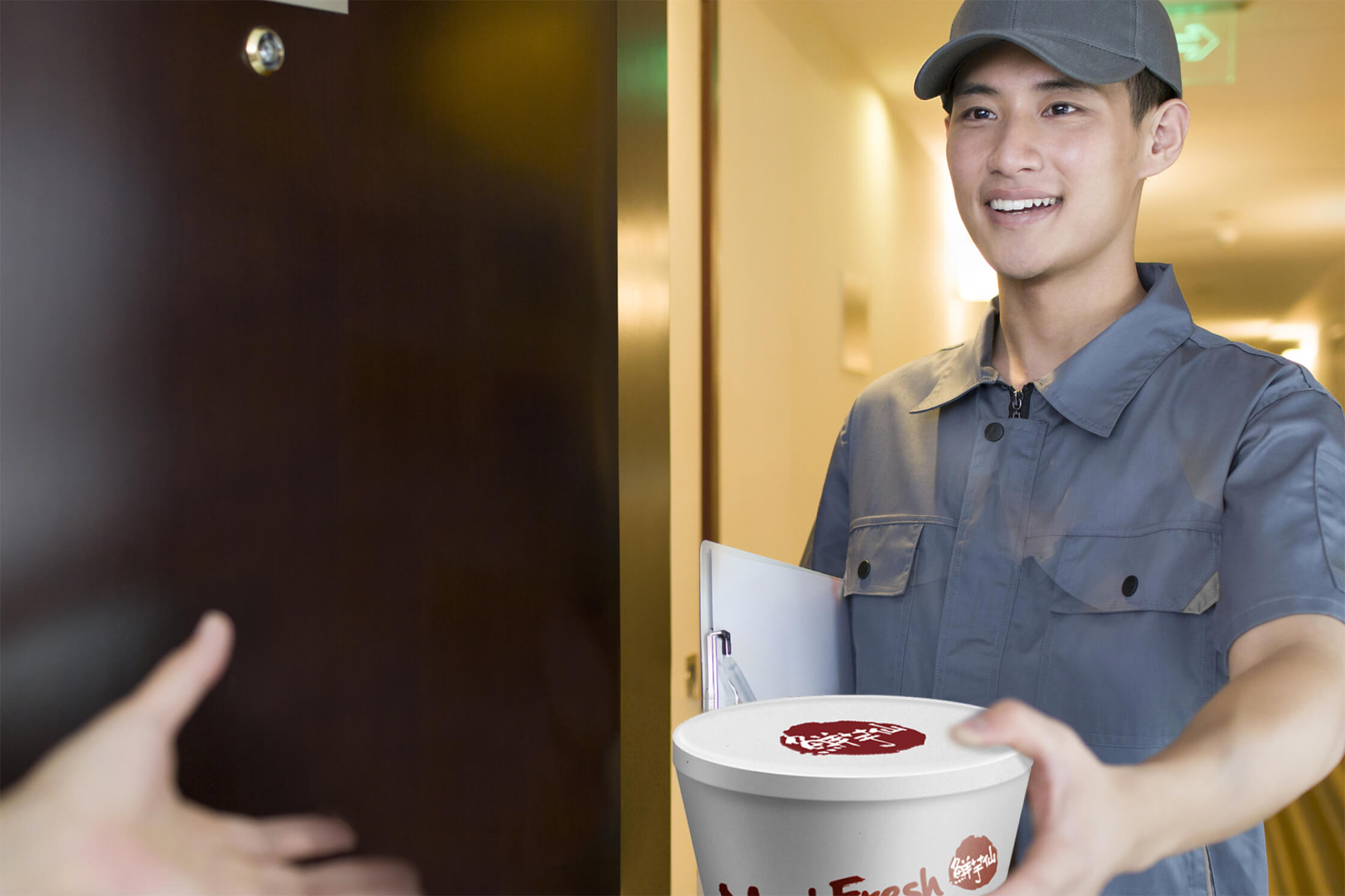 By using the brand color of MeetFresh to fill up the delivery packaging, there is a stronger brand recognition. The overall visual enhancement is more modern.